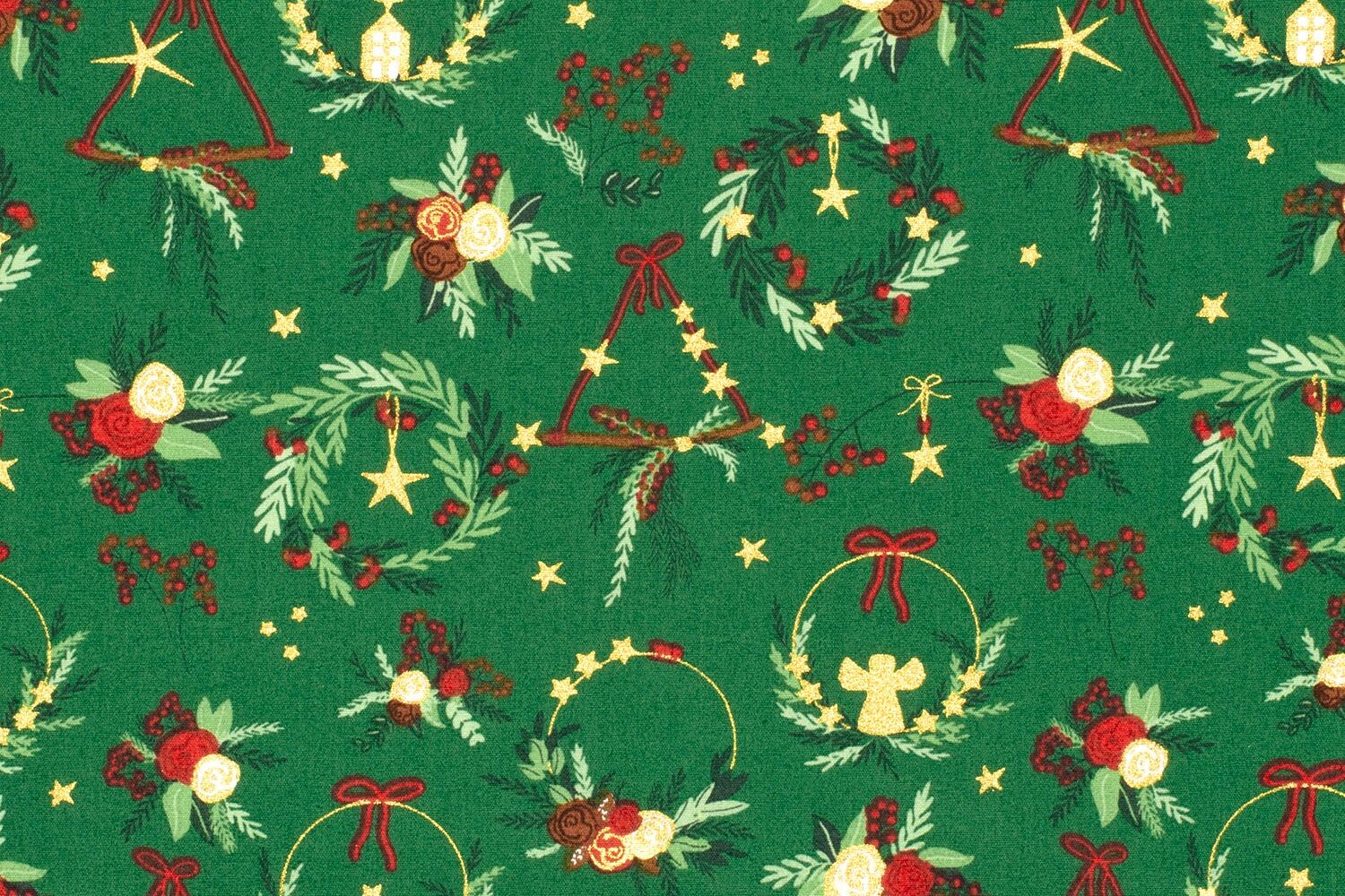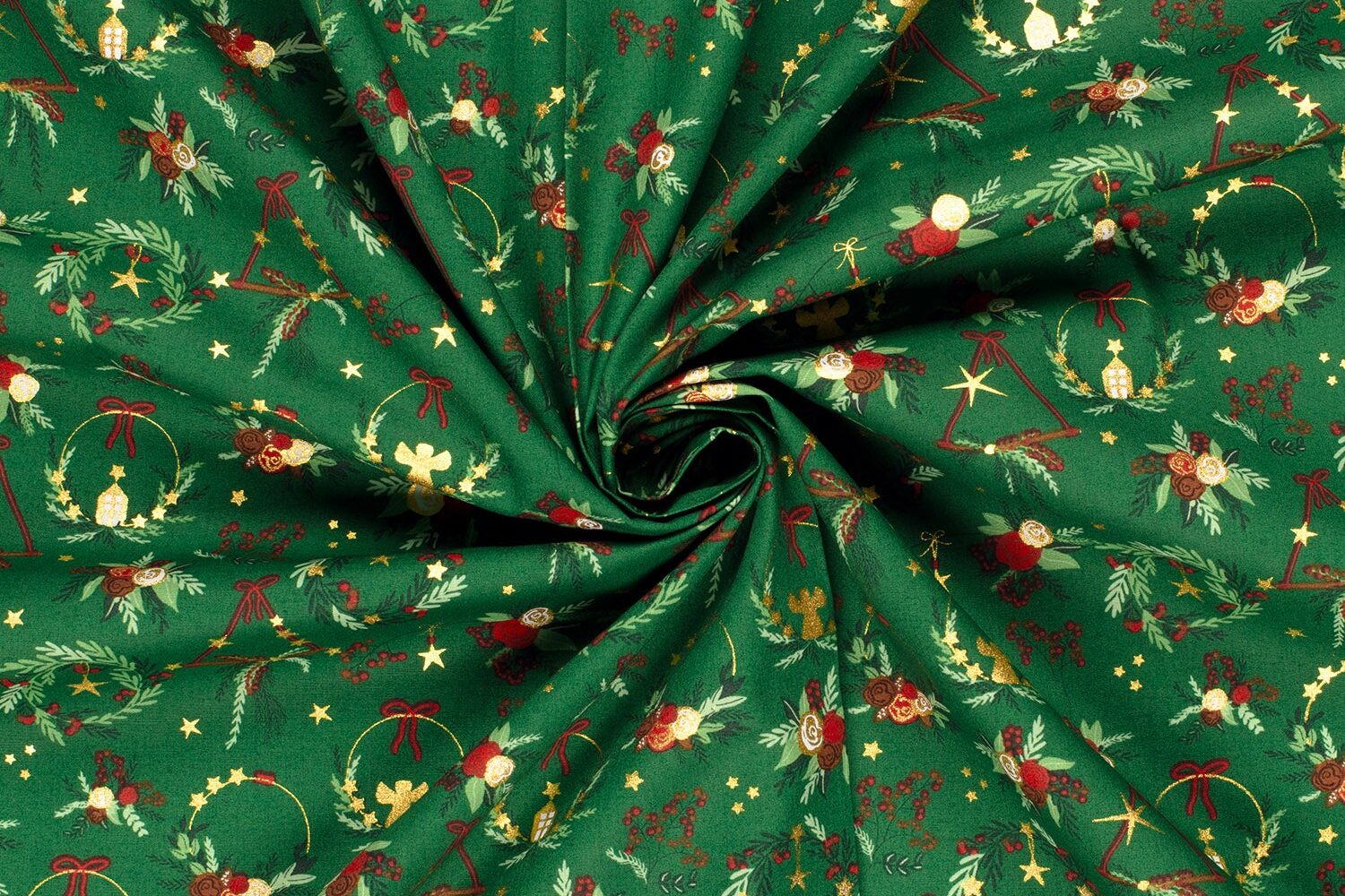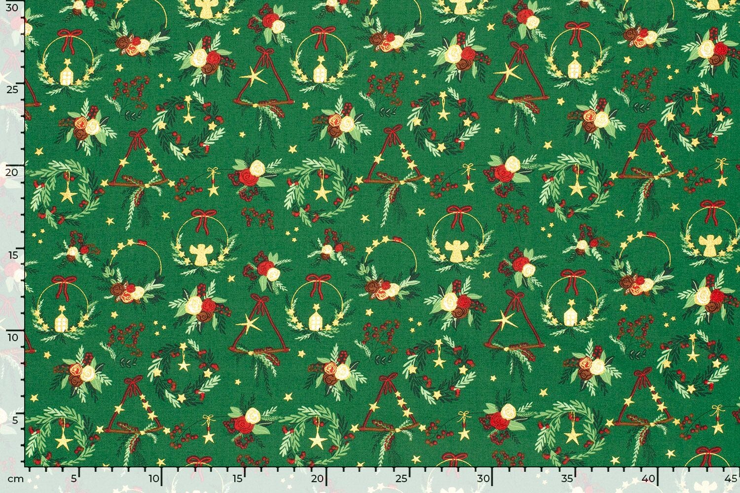 Mooie katoenen kerst stof met een print van kerstkransen in foliedruk.